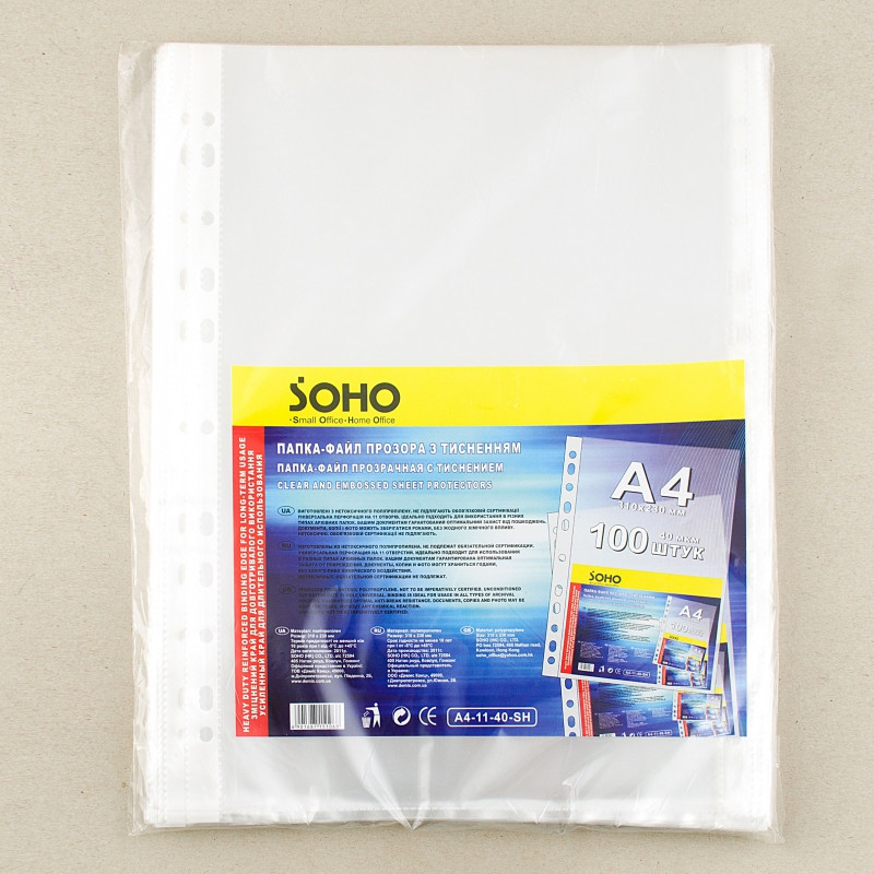 файли торгової марки SOHO виготовлені з прозорого поліпропілену з глянсовою поверхнею і являють собою канцелярський пакет із полями-кишенею, у який вставлена вінілова смужка для закріплення отворів на всі довжині полів, призначених для підшивки в накопичувачі, швидкозшивачі, реєстратори. Файл вміщує аркуші паперу формату А4.